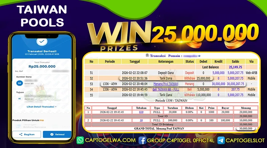 Beberapa situs togel online hanya menjanjikan tanpa ada bukti yang jelas, tapi di CAPTOGEL semua pasti terbukti dan jelas, BUKTI JACKPOT TOGEL ONLINE, SLOT ONLINE & LIVE CASINO secara nyata. Melalui kemenangan member setiap hari nya, jackpot besar togel online 2Dā3Dā4D maupun jackpot besar slot gacor, hingga bukti transaksi kemenangan yang benar-benar masuk ke saldo member.